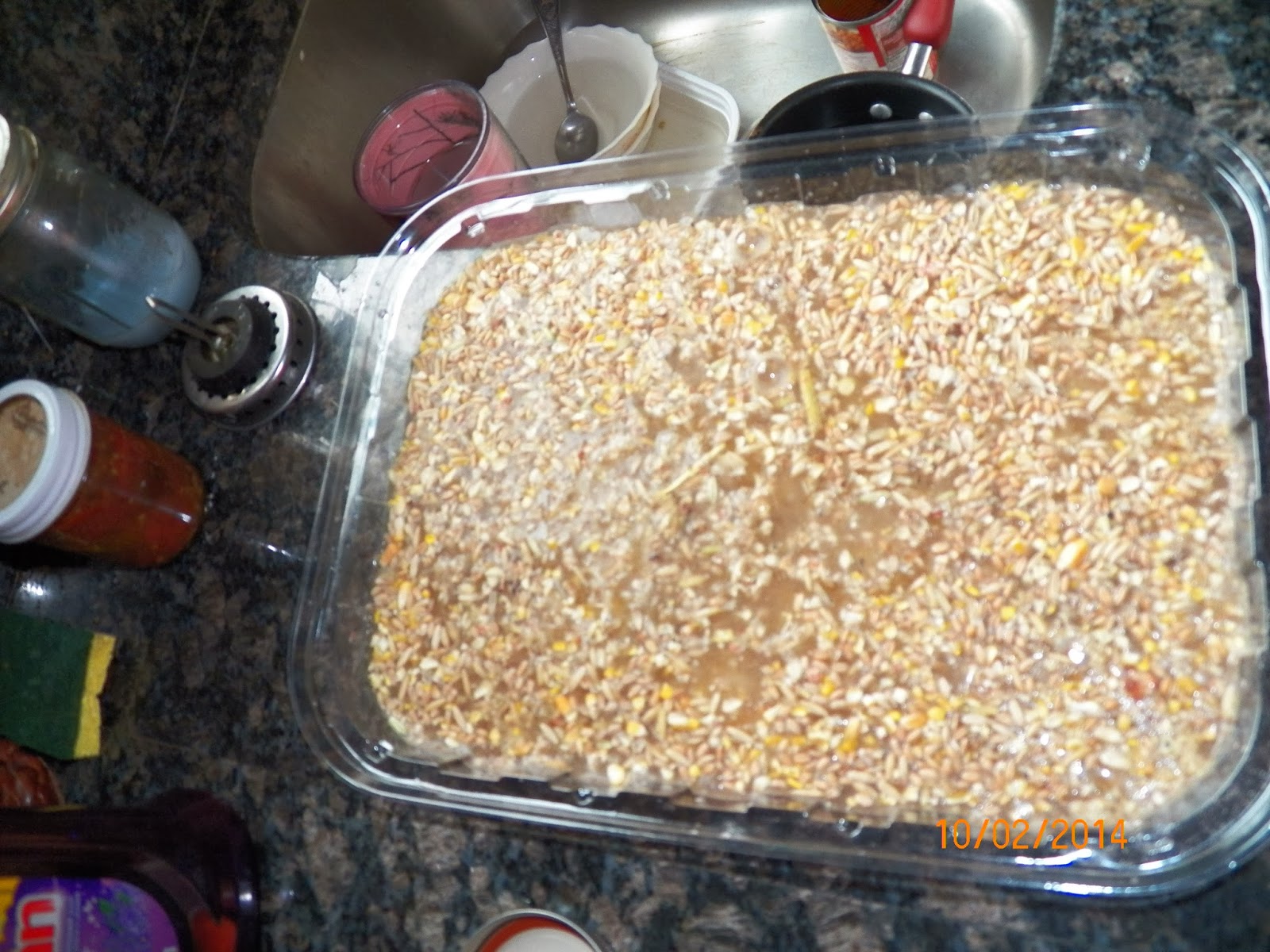 There was what we thought would be a neat DIY project we saw on one of our chicken sites, and with plenty of free time we thought we would give it a try. Chickens love grass, and this time of year green grass is few and far between. We have scratch grain on hand to supplement their feed anyway, so this was a no trip to town project. First we soaked a couple scoops of scratch grain overnight in plain tap water.
